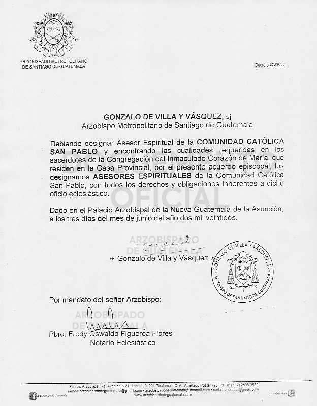 El señor Arzobispo de la Arquidiócesis de Santiago de Guatemala, nombra asesor espiritual de la COMUNIDAD CATÓLICA SAN PABLO a los sacerdotes de la Congregación de Inmaculado Corazón de María, que residen en la Casa Provincial. DECRETO 47-06-2022