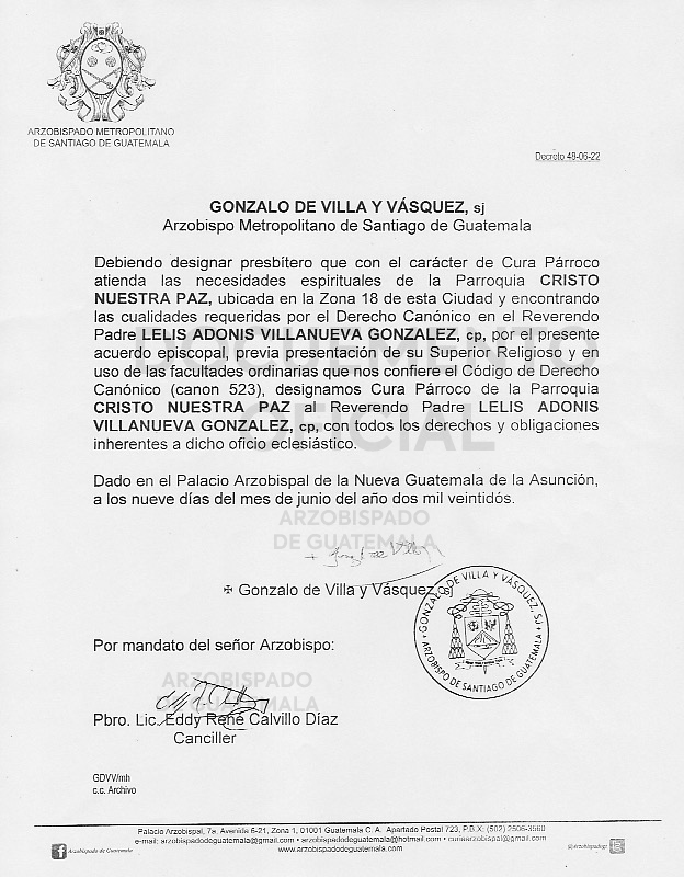 El señor Arzobispo de la Arquidiócesis de Santiago de Guatemala, nombra Cura Párroco de la PARROQUIA CRISTO NUESTTRA PAZ, ubicado en la Zona 18 de esta Ciudad, al Reverendo Padre LELIS ADONIS VILLANUEVA GONZALEZ, cp. DECRETO 48-06-2022