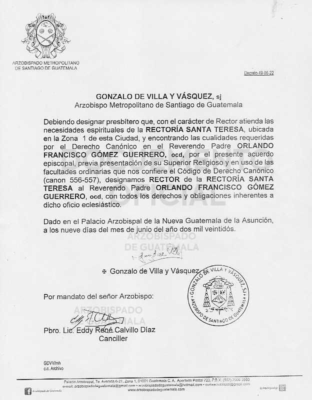 El señor Arzobispo de la Arquidiócesis de Santiago de Guatemala, nombra Rector de la RECTORÍA SANTA TERESA, ubicado en la Zona 1 de esta Ciudad, al Reverendo Padre ORLANDO FRANCISCO GÓMEZ GUERRERO, ocd. DECRETO 49-06-2022