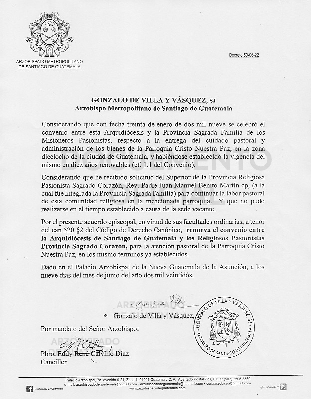 El señor Arzobispo de la Arquidiócesis de Santiago de Guatemala, renueva el convenio entre la Arquidiócesis de Santiago de Guatemala y los Religiosos Pasionistas Provincia Sagrado Corazón, para la atención pastoral de la Parroquia Cristo Nuestra Paz, en los mismo términos ya establecidos. DECRETO 50-06-202