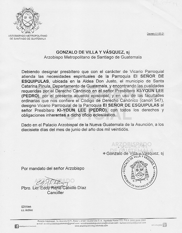 El señor Arzobispo de la Arquidiócesis de Santiago de Guatemala, nombra Vicario Parroquial de la Parroquia EL SEÑOR DE ESQUIPULAS, ubicada en la Aldea Don Justo, el municipio de Santa Catarina Pinula al señor presbítero KI-YOUN LEE (PEDRO)DECRETO 51-06-2022