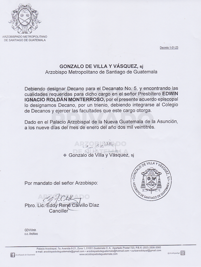 El señor Arzobispo de la Arquidiócesis de Santiago de Guatemala, designa DECANO para el DECANATO 5 al señor Presbítero EDWIN IGNACIO ROLDÁN MONTERROSO. DECRETO 01-01-2023