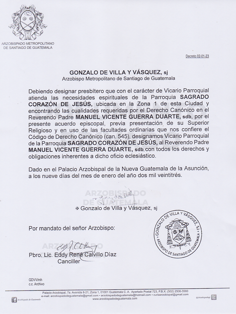 El señor Arzobispo de la Arquidiócesis de Santiago de Guatemala, nombra Vicario Parroquial de la Parroquia SAGRADO CORAZÓN DE JESÚS ubicada en la Zona 1 de esta Ciudad, al Reverendo Padre MANUEL VICENTE GUERRA DUARTE. DECRETO 02-01-2023