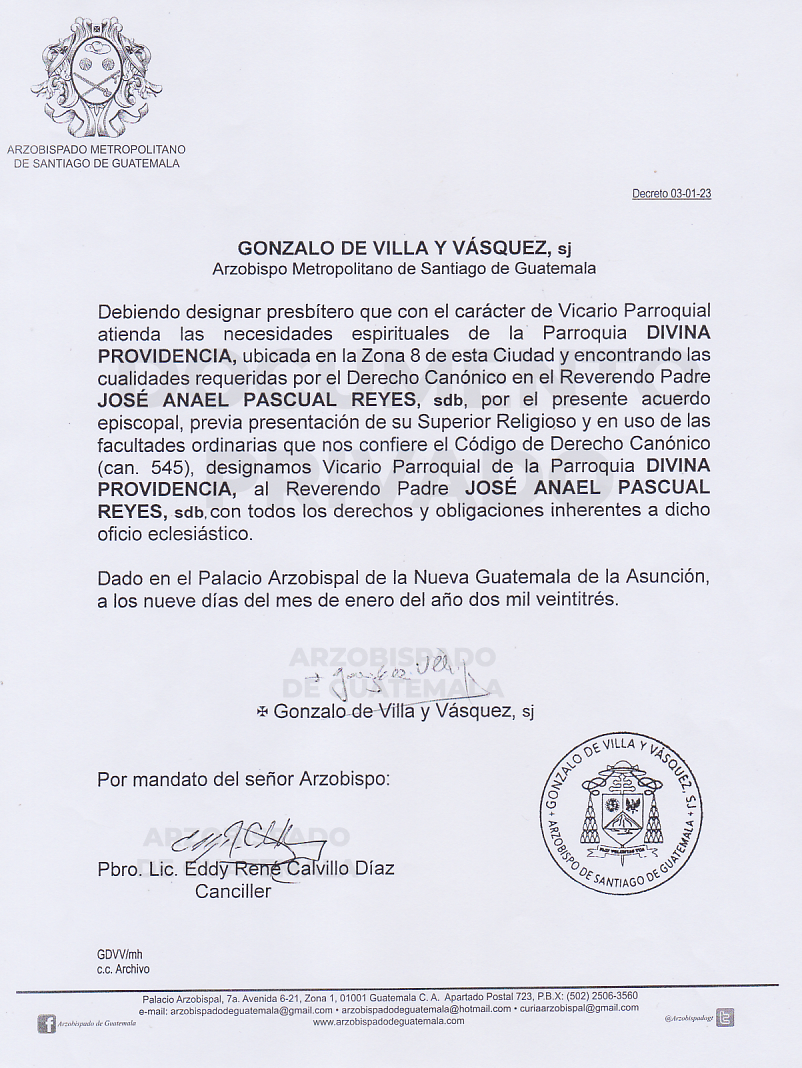 El señor Arzobispo de la Arquidiócesis de Santiago de Guatemala, nombra Vicario Parroquial de la Parroquia DIVINA PROVIDENCIA ubicada en la Zona 8 de esta Ciudad, al Reverendo Padre JOSÉ ANAEL PASCUAL REYES, sdb. DECRETO 03-01-2023