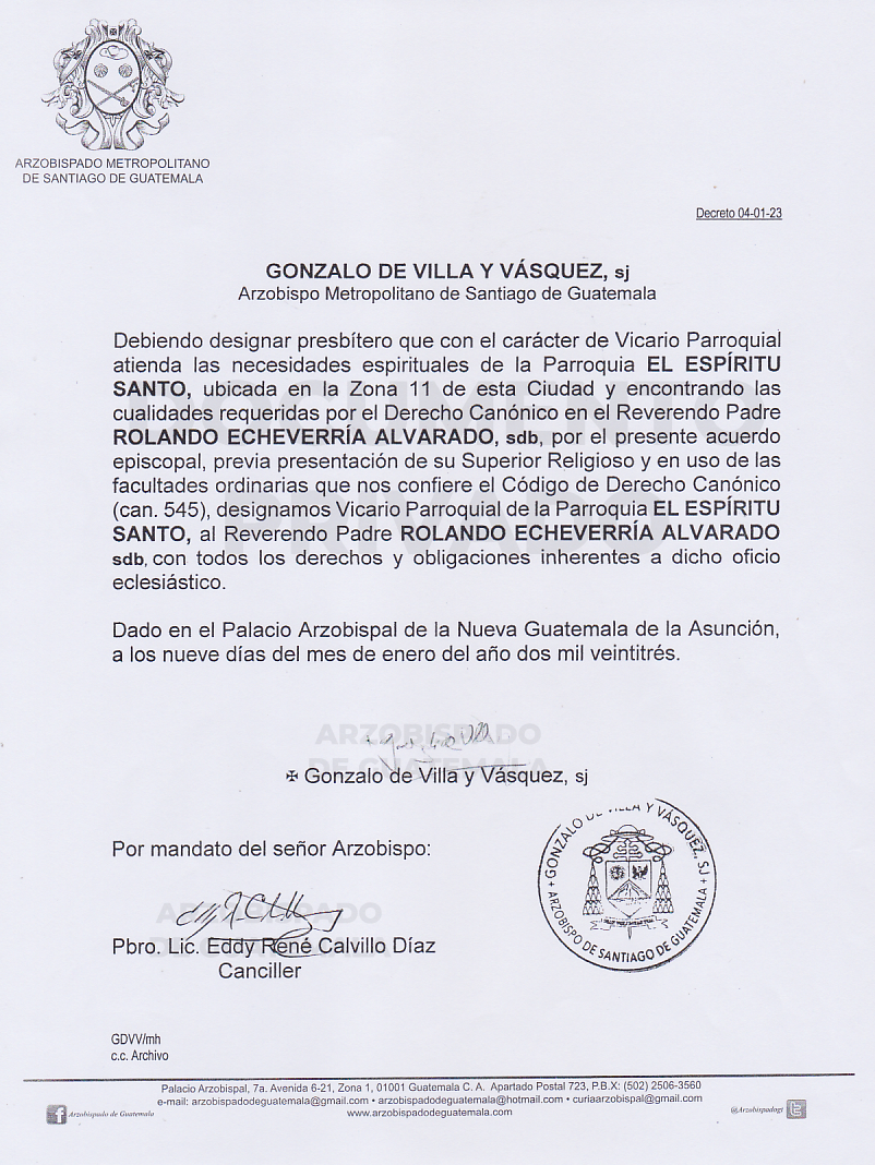 El señor Arzobispo de la Arquidiócesis de Santiago de Guatemala, nombra Vicario Parroquial de la Parroquia EL ESPIRITU SANTO ubicada en la Zona 11 de esta Ciudad, al Reverendo Padre ROLANDO ECHEVERRÍA ALVARADO, sdb. DECRETO 04-01-2023