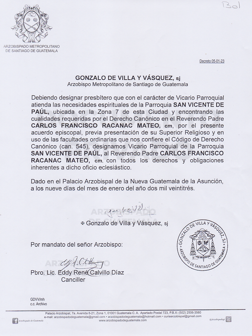 El señor Arzobispo de la Arquidiócesis de Santiago de Guatemala, nombra Vicario Parroquial de la Parroquia SAN VICENTE DE PAÚL ubicada en la Zona 7 de esta Ciudad, al Reverendo Padre CARLOS FRANCISCO RECANAC MATEO, cm. DECRETO 05-01-2023
