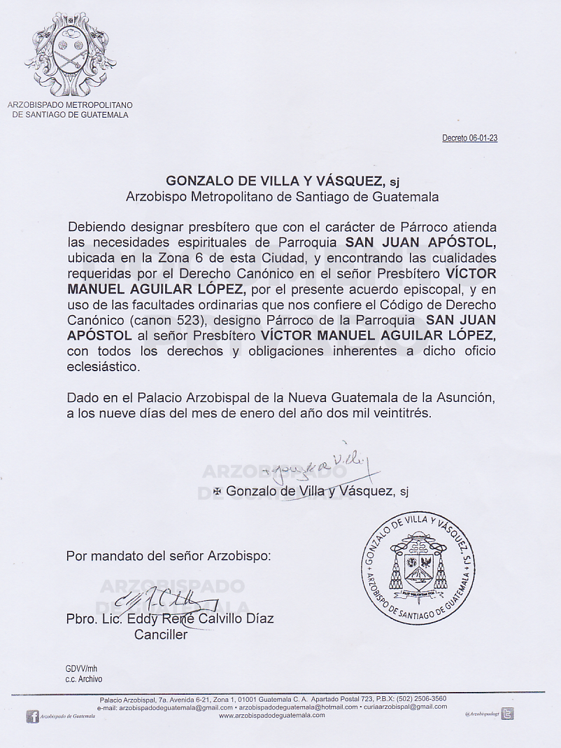 El señor Arzobispo de la Arquidiócesis de Santiago de Guatemala, nombra Párroco de la Parroquia SAN JUAN APÓSTOL, ubicada en la zona 6 de esta ciudad, al señor presbítero VÍCTOR MANUEL AGUILAR LÓPEZ. DECRETO 06-01-2023