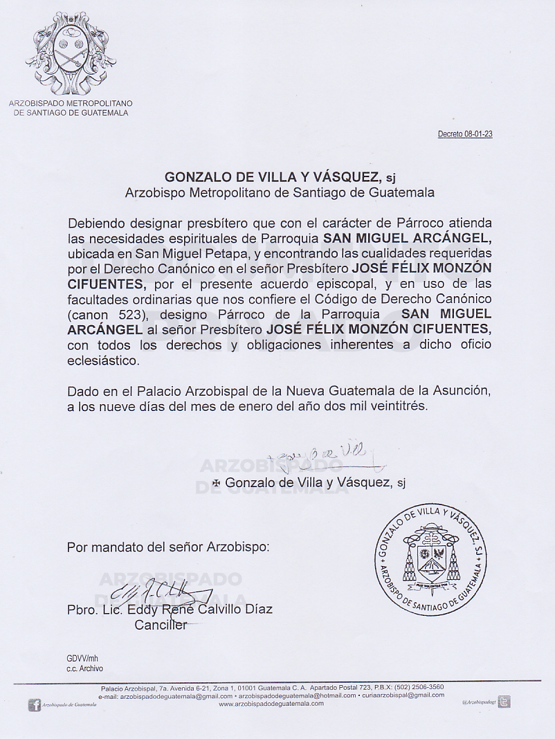 El señor Arzobispo de la Arquidiócesis de Santiago de Guatemala, nombra Párroco de la Parroquia SAN MIGUEL ARCÁNGEL ubicada en San Miguel Petapa, al señor presbítero JOSÉ FÉLIX MONZÓN CIFUENTES. DECRETO 08-01-2023