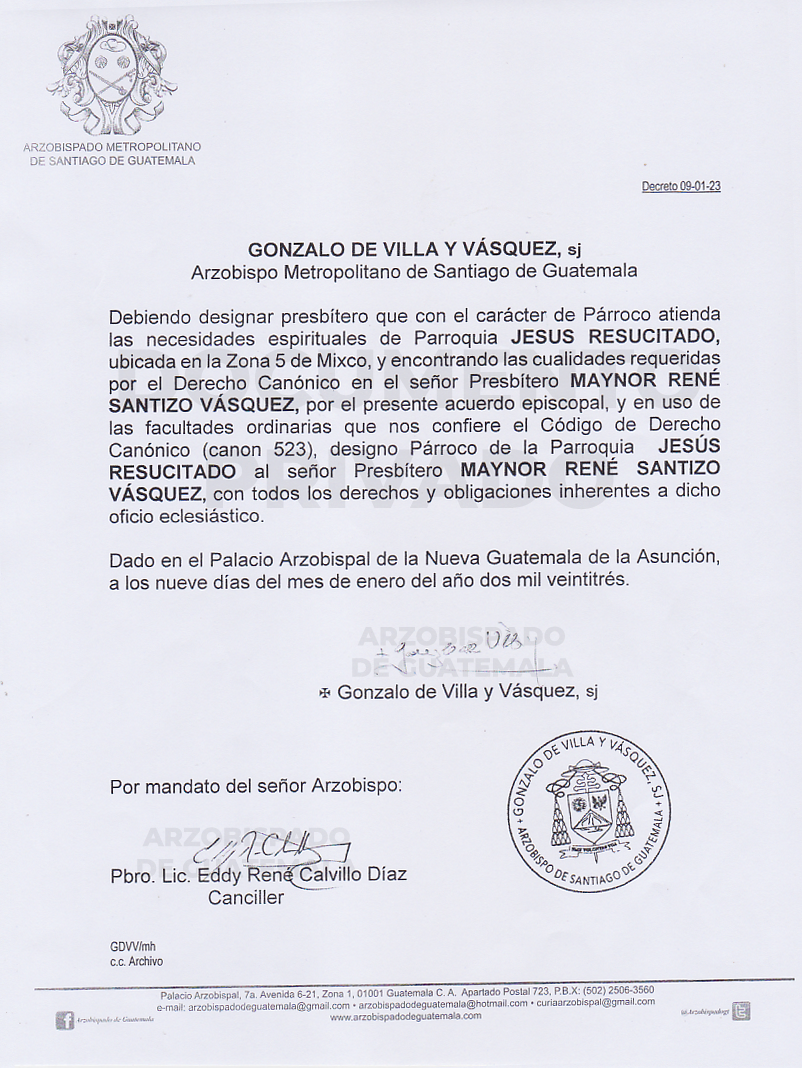El señor Arzobispo de la Arquidiócesis de Santiago de Guatemala, nombra Párroco de la Parroquia JESÚS RESUCITADO ubicada en Zona 5 de Mixco, al señor presbítero MAYNOR RENÉ SANTIZO VÁSQUEZ. DECRETO 09-01-2023