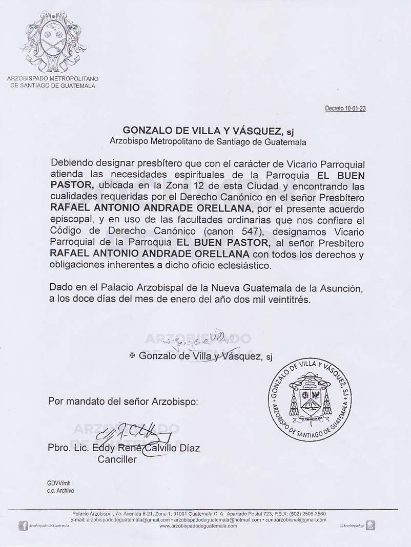 El señor Arzobispo de la Arquidiócesis de Santiago de Guatemala, nombra Vicario Parroquial de la Parroquia EL BUEN PASTOR ubicada en la Zona 12 de este Ciudad, al señor presbítero RAFAEL ANTONIO ANDREDE ORELLANA. DECRETO 10-01-2023