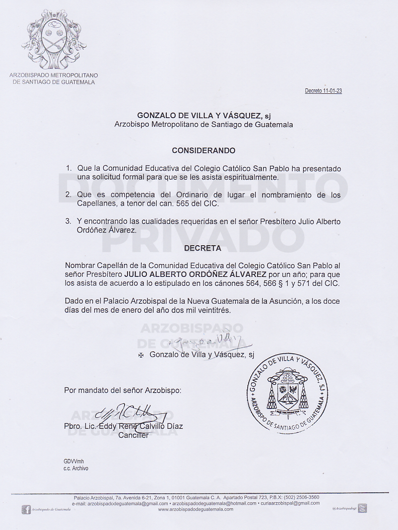 El señor Arzobispo de la Arquidiócesis de Santiago de Guatemala, nombra Capellán de la Comunidad Educativa del Colegio Católico San Pablo, al señor presbítero JULIO ALBERTO ORDÓÑEZ ALAVREZ. DECRETO 11-01-2023