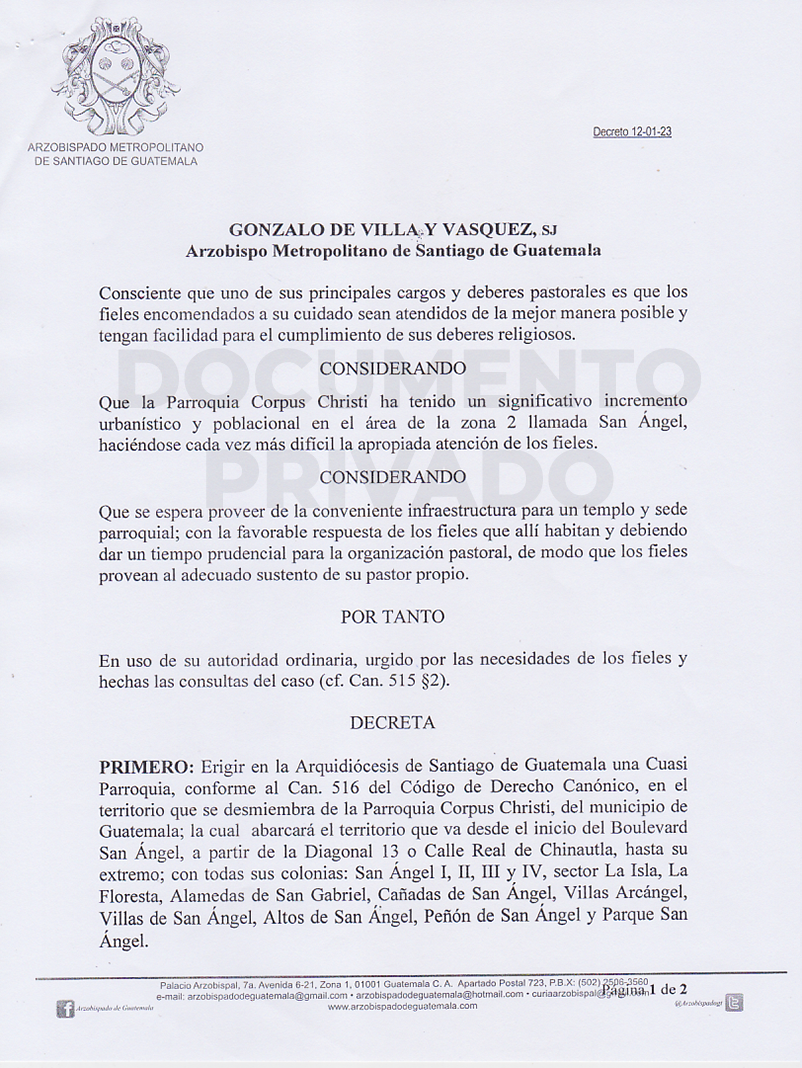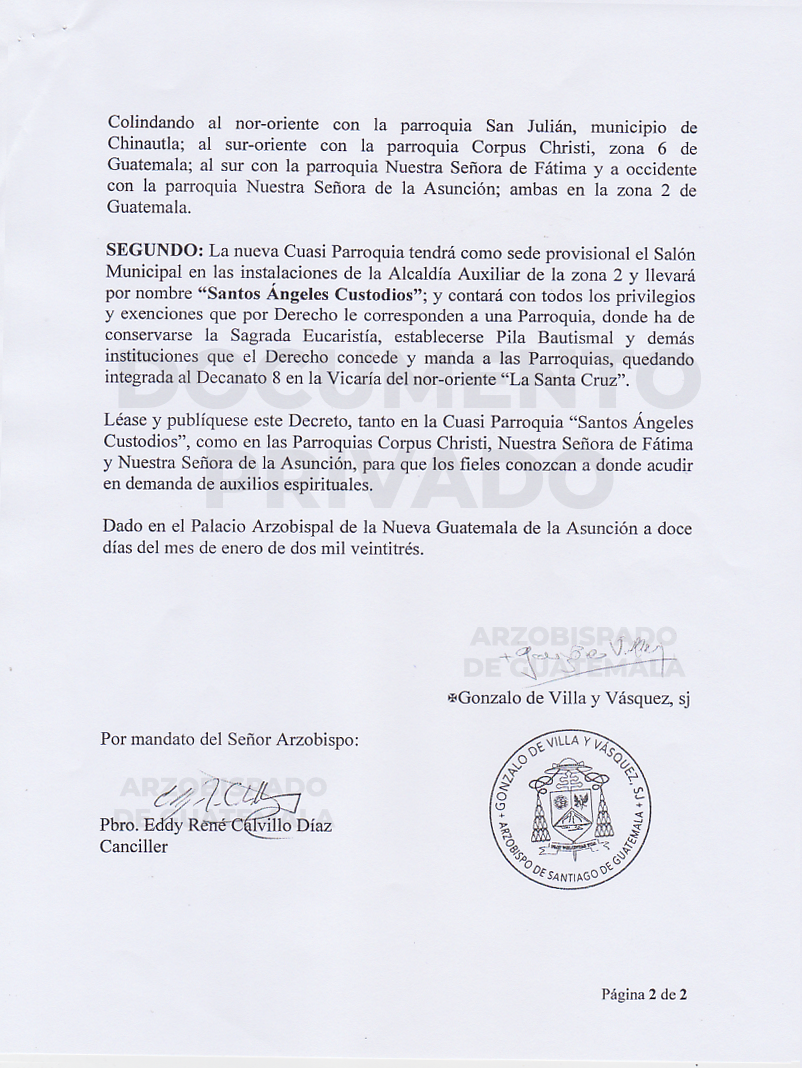 El señor Arzobispo de la Arquidiócesis de Santiago de Guatemala, demiembra de la Parroquia Corpus Christi del municipio de Guatemala, la cual abarcá el territorio que se va desde el inicio del Boulevar San Ángel, a partir de la diagonal 13 o calle real de Chinautla, la nueva Cuasi Parroquia llevará por nombre “SANTOS ÁNGELES CUSTODIOS” y tendra como sede provisional el Salón Municipal en las Instalaciones de la Alcaldia Auxiliar de la Zona 2. DECRETO 12-01-2023 PÁG. 01 Y PÁG. 02