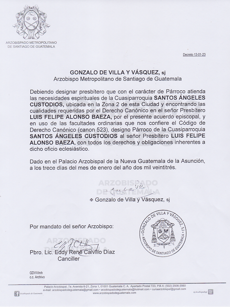 El señor Arzobispo de la Arquidiócesis de Santiago de Guatemala, nombra párroco de la Parroquia SANTOS ÁNGELES CUSTODIOS, ubicada en la Zona 2 de esta Ciudad, al señor presbítero LUIS FELIPE ALONSO BAEZA. DECRETO 13-01-2023