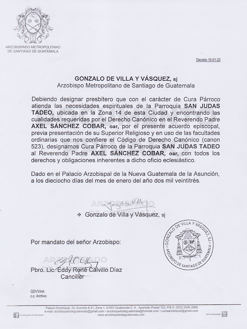El señor Arzobispo de la Arquidiócesis de Santiago de Guatemala, nombra Cura Párroco de la Parroquia SAN JUDAS TADEO, ubicada en la Zona 14 de esta Ciudad, al Reverendo Padre AXEL SÁNCHEZ COBAR, oar. DECRETO 15-01-2023