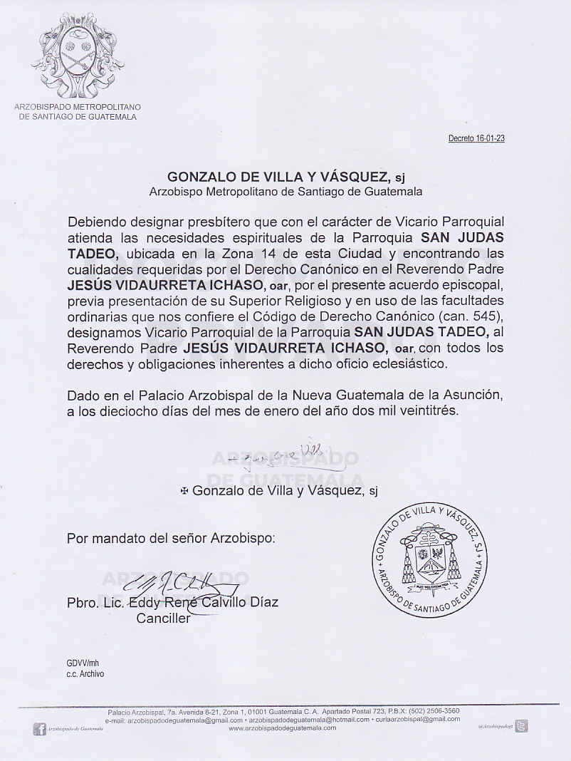 El señor Arzobispo de la Arquidiócesis de Santiago de Guatemala, nombra Viario Parroquial de la Parroquia SAN JUDAS TADEO, ubicada en la Zona 14 de esta Ciudad, al Reverendo Padre JESÚS VIDAURRETA ICHASO, oar. DECRETO 16-01-2023