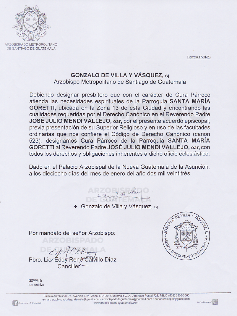 El señor Arzobispo de la Arquidiócesis de Santiago de Guatemala, nombra Cura Párroco de la Parroquia SANTA MARÍA GORETTI, ubicada en la Zona 13 de esta Ciudad, al Reverendo Padre JOSÉ JULIO MENDI VALLEJO, oar. DECRETO 17-01-2023