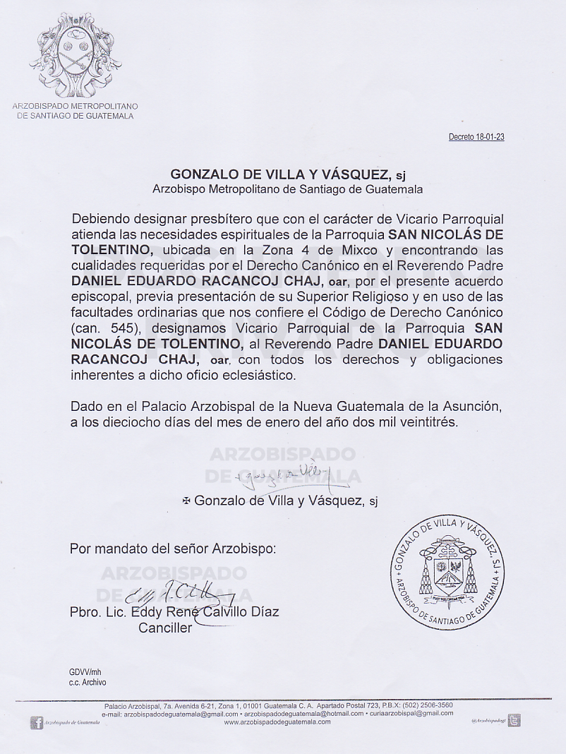 El señor Arzobispo de la Arquidiócesis de Santiago de Guatemala, nombra Viario Parroquial de la Parroquia SAN NICOLÁS DE TOLENTINO, ubicada en la Zona 4 de Mixco, al Reverendo Padre DANIEL EDUARDO RACANCOJ CHAJ, oar. DECRETO 18-01-2023