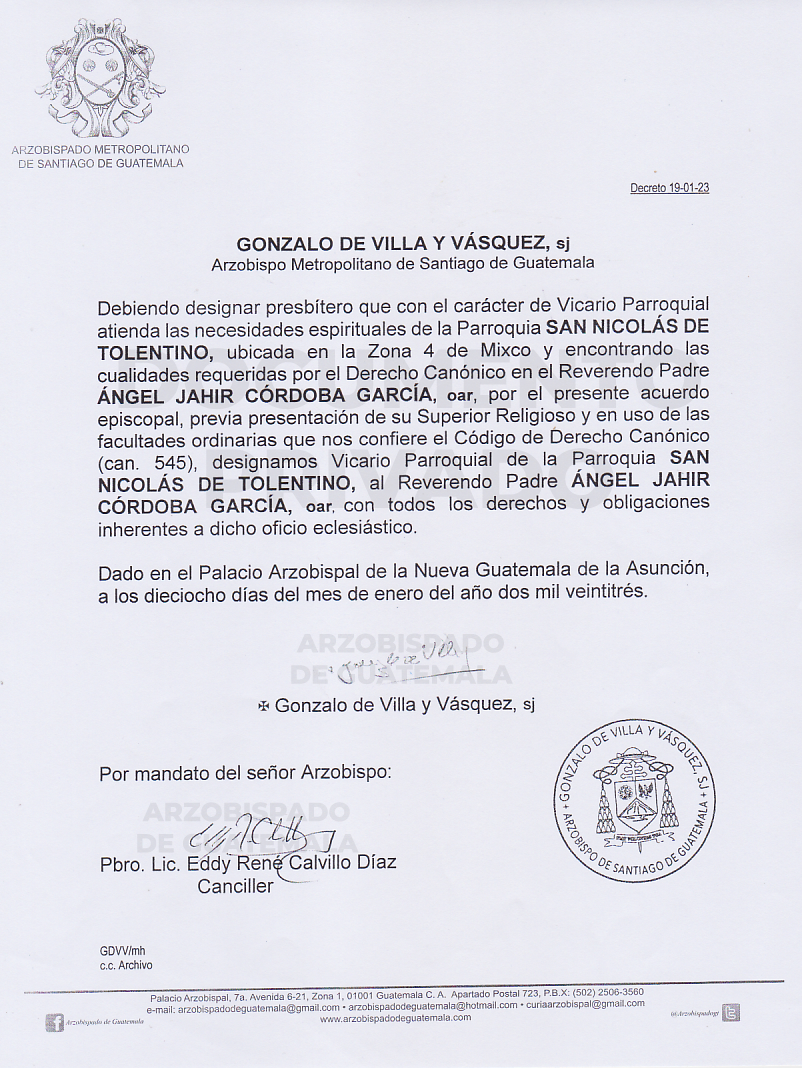 El señor Arzobispo de la Arquidiócesis de Santiago de Guatemala, nombra Viario Parroquial de la Parroquia SAN NICOLÁS DE TOLENTINO, ubicada en la Zona 4 de Mixco, al Reverendo Padre ÁNGEL JAHIR CÓRDOBA GARCÍA, oar. DECRETO 19-01-2023
