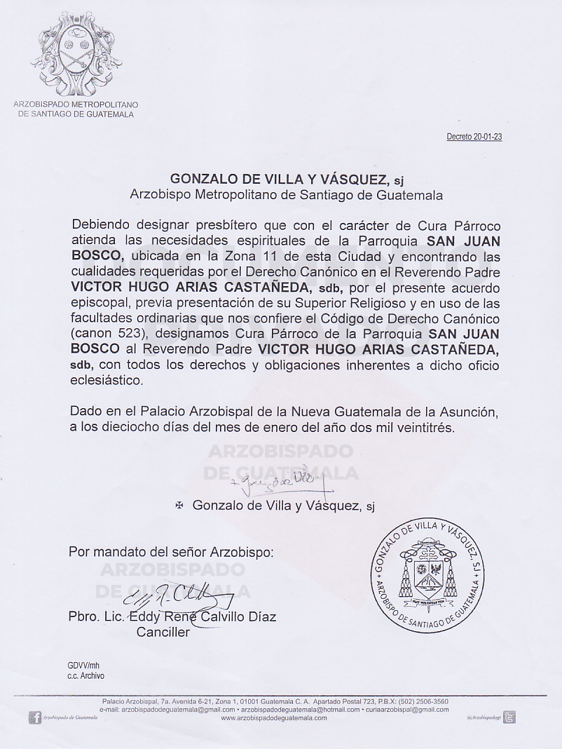 El señor Arzobispo de la Arquidiócesis de Santiago de Guatemala, nombra Cura Párroco de la Parroquia SAN JUAN BOSCO, ubicada en la Zona 11 de esta Ciudad, al Reverendo Padre VICTO HUGO ARIAS CASTAÑEDA, sdb. DECRETO 20-01-2023
