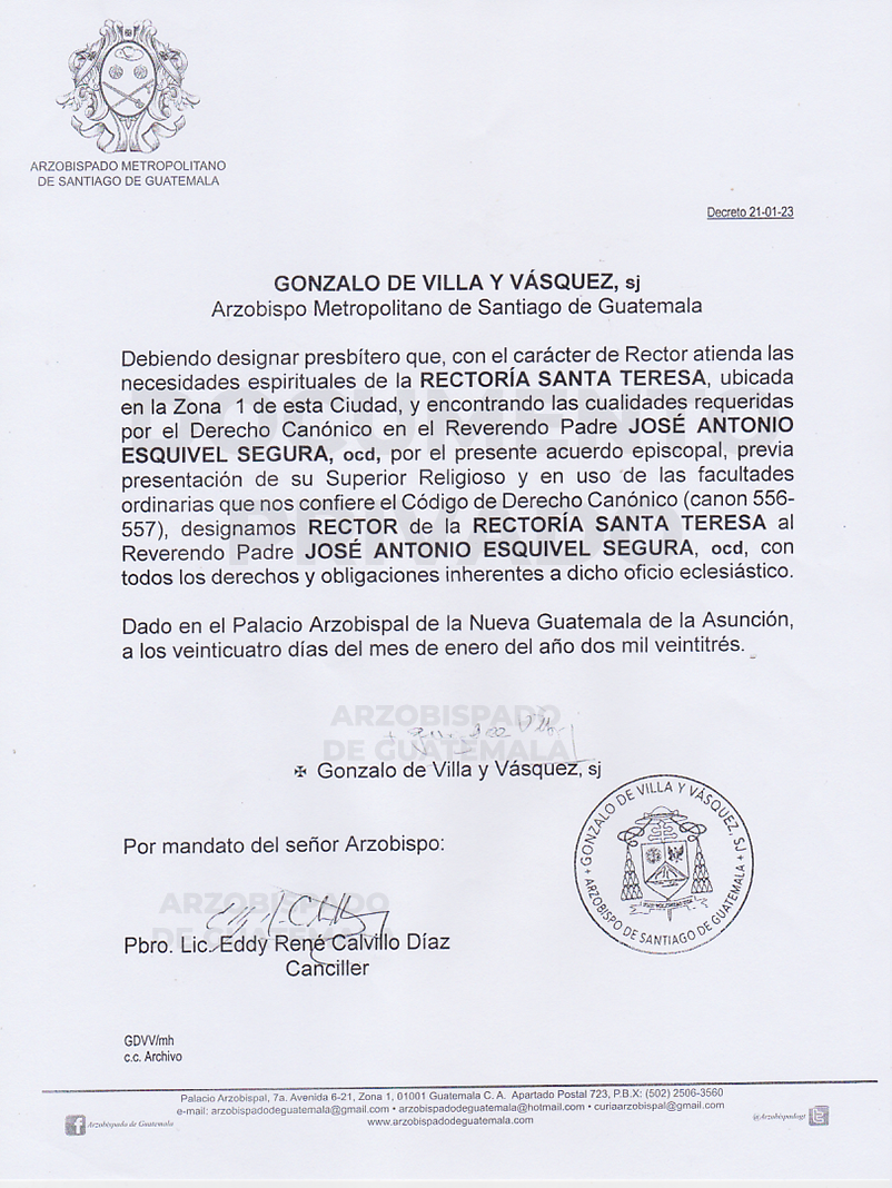 El señor Arzobispo de la Arquidiócesis de Santiago de Guatemala, nombra Rector de la Rectoría SANTA TERESA, ubicada en la zona 1 de esta ciudad, al Reverendo Padre JOSÉ ANTONIO ESQUIVEL SEGURA, ocd. DECRETO 21-01-2023