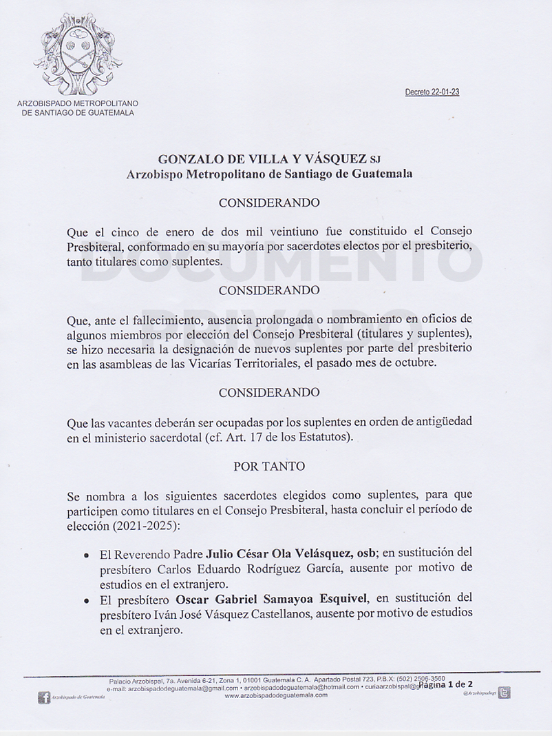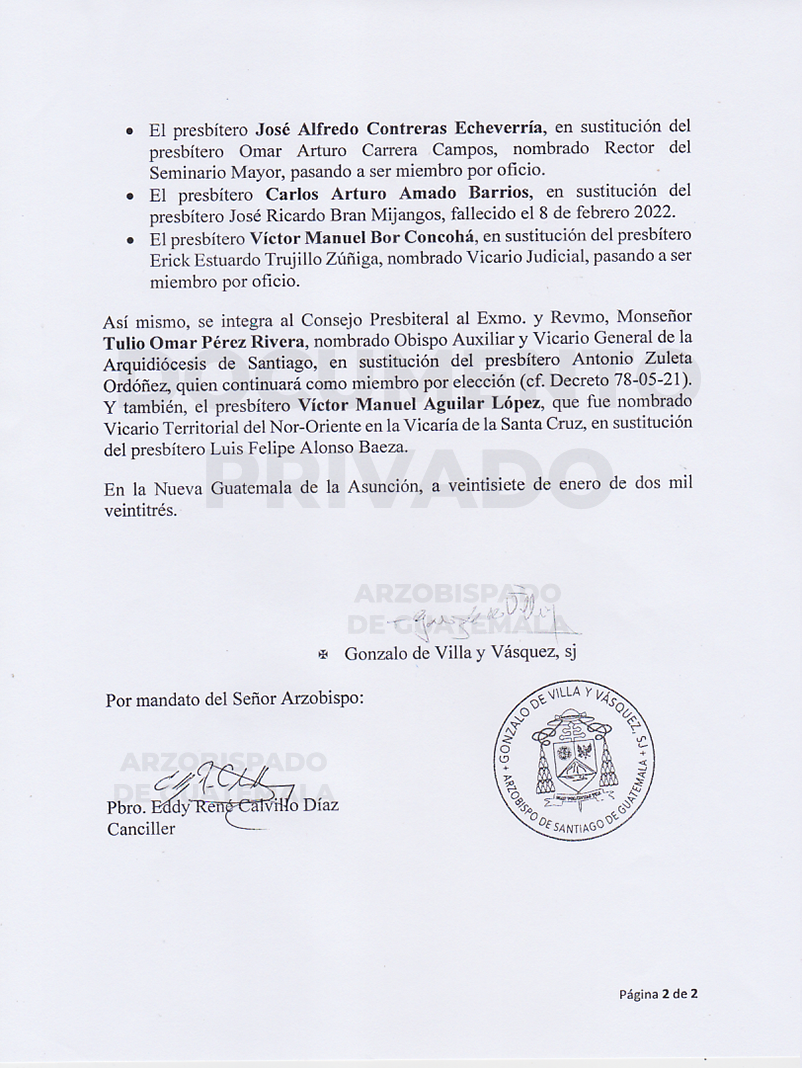 El señor Arzobispo de la Arquidiócesis de Santiago de Guatemala, constituye el CONSEJO PRESBITERAL de esta Arquidiócesis, hasta concluir el periodo (2021- 2025) DECRETO 22-01-2023. PÁG. 01 y PÁG. 02
