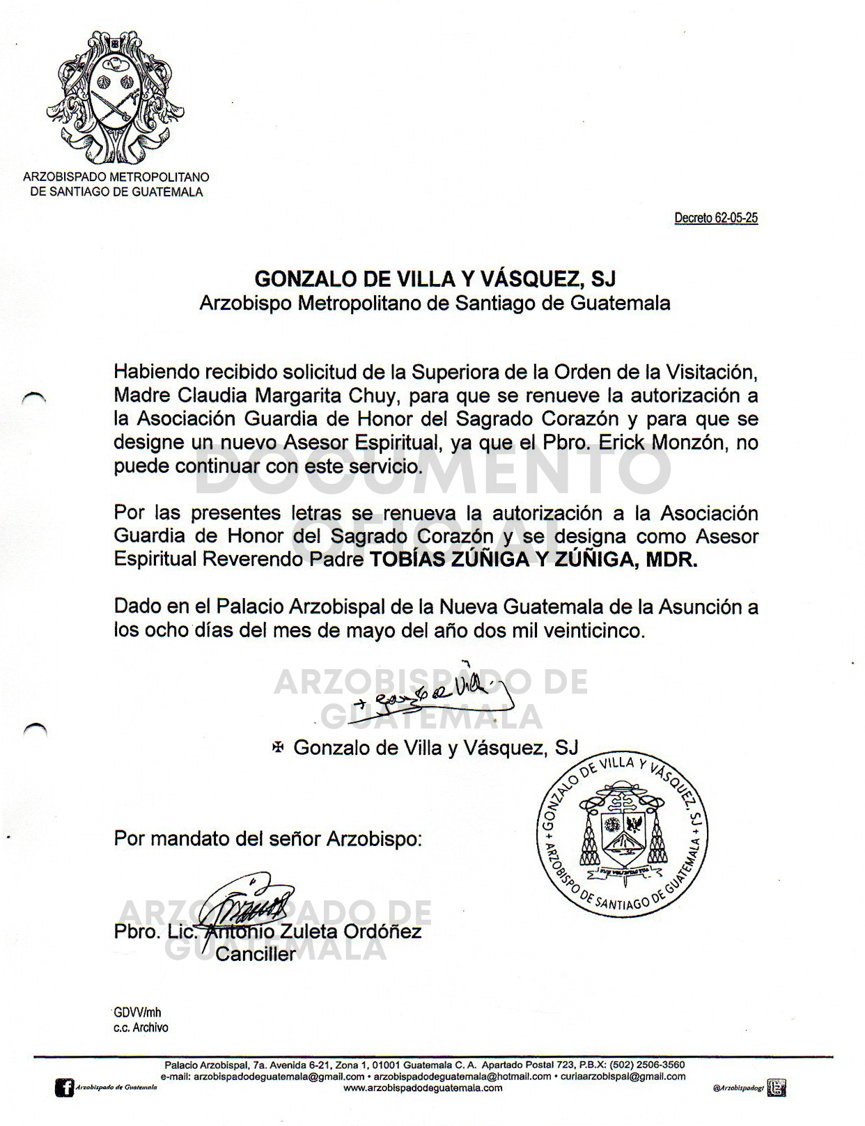 El señor Arzobispo de la Arquidiócesis de Santiago de Guatemala designa como Asesor Espiritual de la Asociación Guradia de Honor del Sagrado Corazón al Reverendo Padre TOBÍAS ZÚÑIGA Y ZÚÑIGA, MDR. DECRETO 62-05-2025