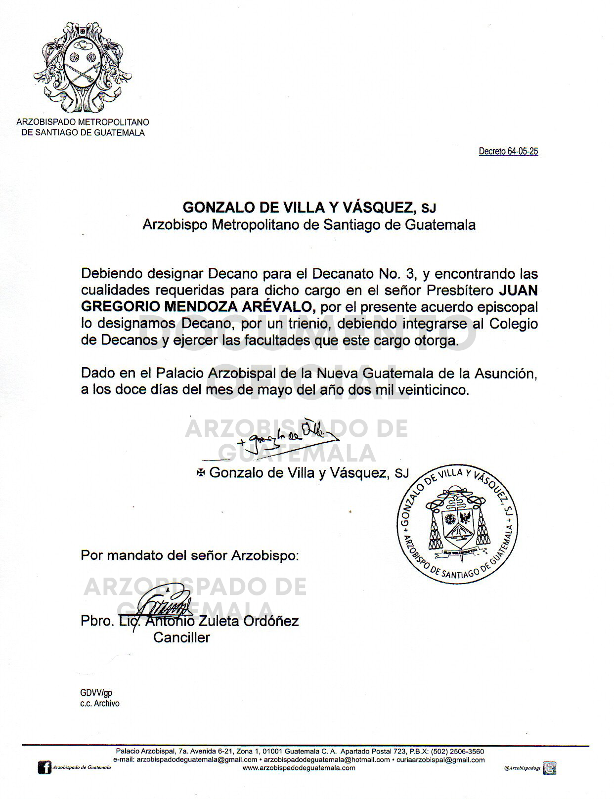 El señor Arzobispo de la Arquidiócesis de Santiago de Guatemala, designa DECANO para el DECANATO 3 al señor Presbítero JUAN GREGORIO MENDOZA ARÉVALO. DECRETO 64-05-2025