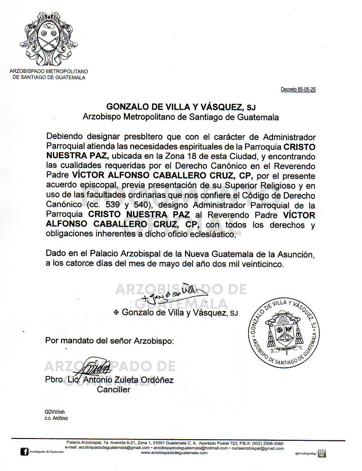 El señor Arzobispo de la Arquidiócesis de Santiago de Guatemala nombra Vicario Parroquial de la Parroquia CRISTO NUESTRA PAZ, ubicada en la Zona 18 de esta ciudad, al Reverendo Padre VÍCTOR ALFONSO CABALLERO CRUZ, CP. DECRETO 65-05-2025