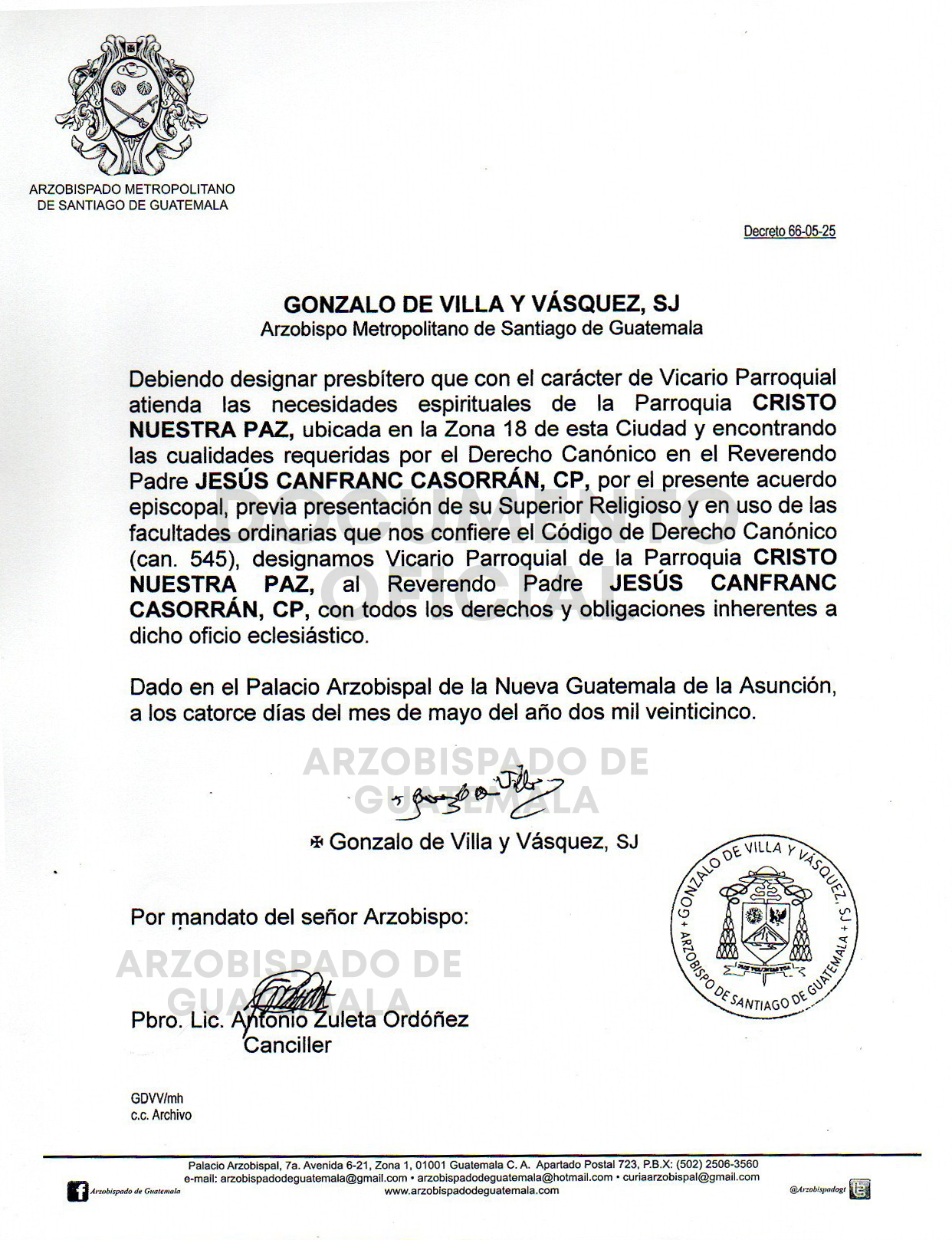 El señor Arzobispo de la Arquidiócesis de Santiago de Guatemala nombra Vicario Parroquial de la Parroquia CRISTO NUESTRA PAZ, ubicada en la Zona 18 de esta ciudad, al Reverendo PadreJESÚS CANFRANC CASORRÁN, CP. DECRETO 66-05-2025