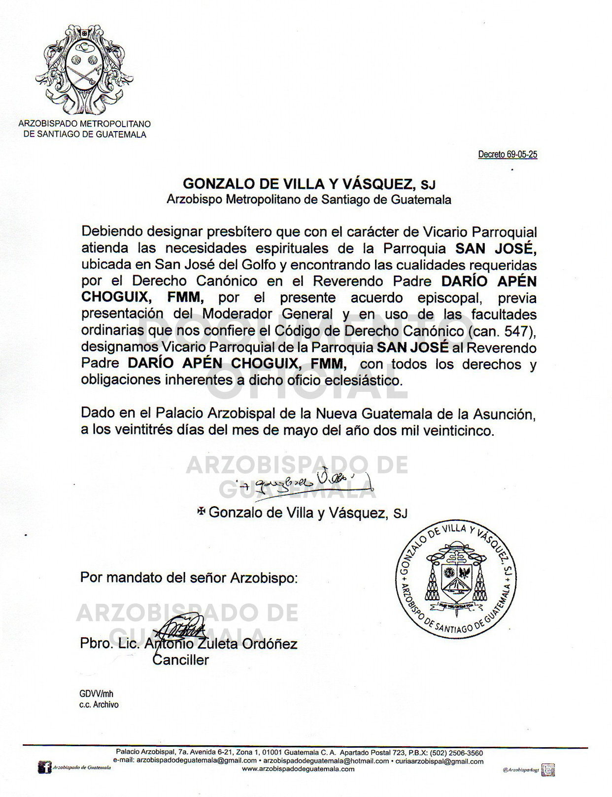 El señor Arzobispo de la Arquidiócesis de Santiago de Guatemala nombra Vicario Parroquial de la Parroquia SAN JOSÉ, ubicada en San José El Golfo, al Reverendo Padre DARÍO APÉN CHOGUIX, FMM. DECRETO 69-05-2025