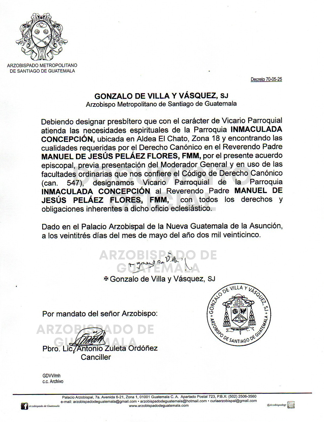 El señor Arzobispo de la Arquidiócesis de Santiago de Guatemala nombra Vicario Parroquial de la Parroquia INMACULADA CONCEPCIÓN, ubicada en la Aldea El Chato, Zona 18, al Reverendo Padre MANUEL DE JESÚS PELAÉZ FLORES, FMM. DECRETO 70-05-2025