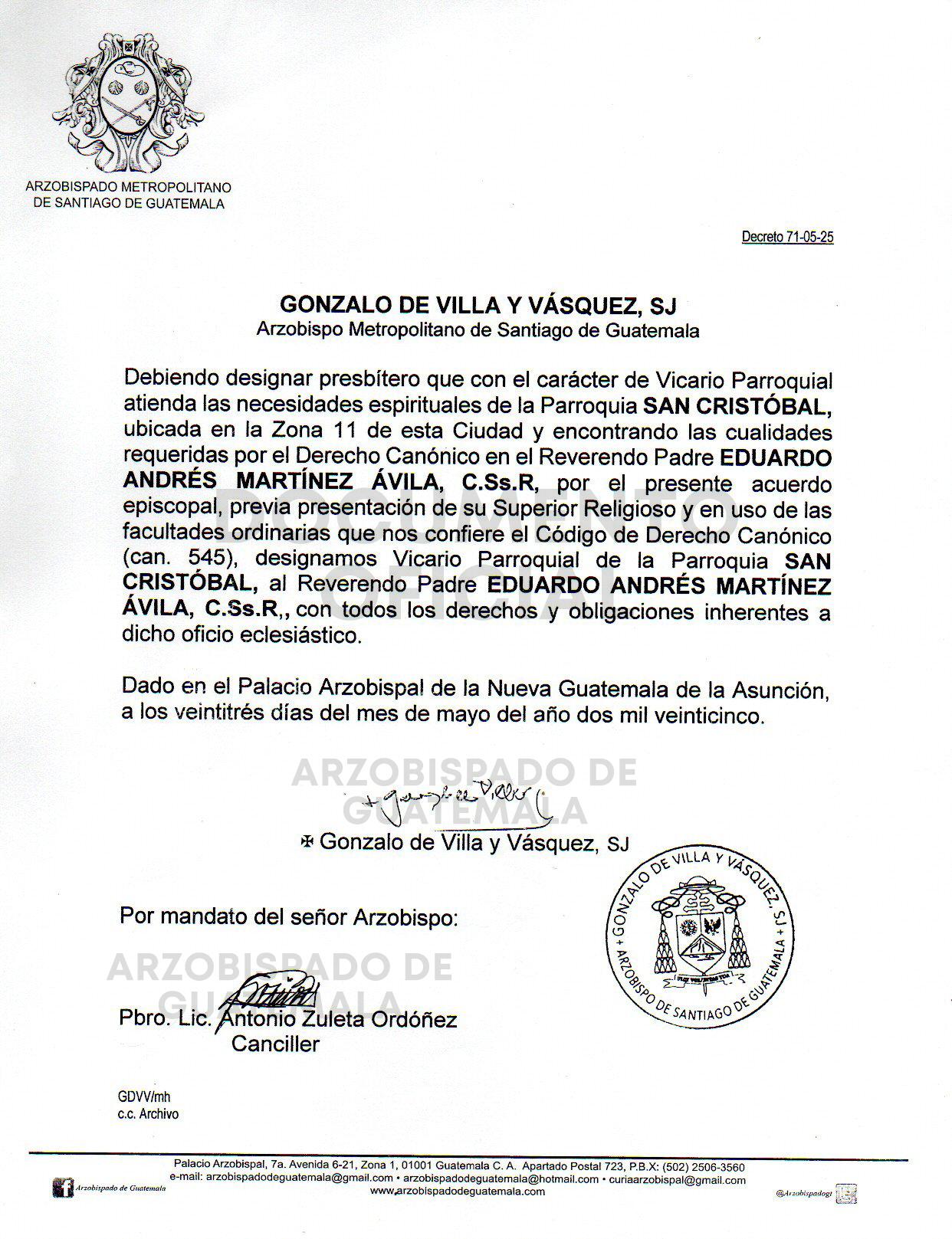 El señor Arzobispo de la Arquidiócesis de Santiago de Guatemala nombra Vicario Parroquial de la Parroquia SAN CRISTÓBAL, ubicada en la Zona 11 de esta ciudad, al Reverendo Padre EDUARDO ANDRÉS MARTÍNEZ ÁVILA, C.SS.R. DECRETO 71-05-2025