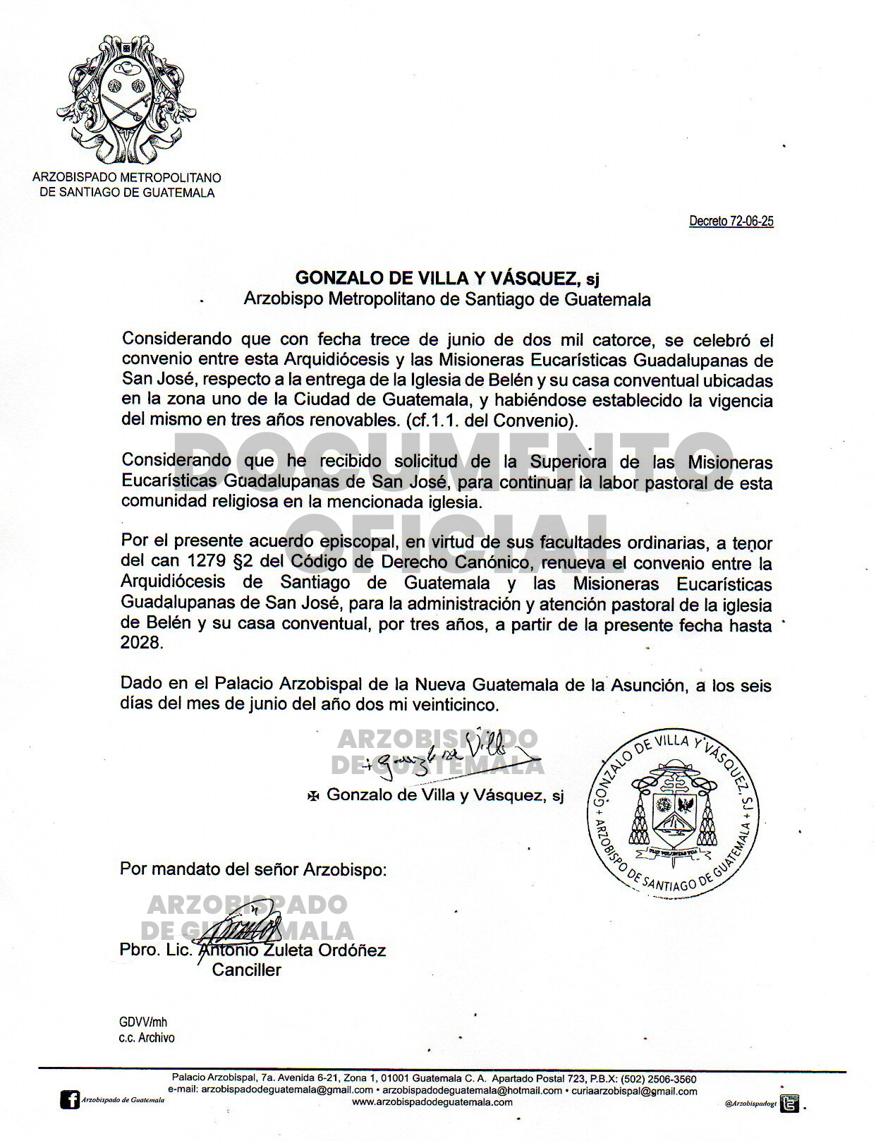 El señor Arzobispo de la Arquidiócesis de Santiago de Guatemala, renueva el convenio entre la Arquidiócesis de Santiago de Guatemala y las Misioneras Eucaristicas Guadalupanas de San José , para la Administración y atención pastoral de la Iglesia de Belén y su Casa Conventual, por tres años, a partir del 6 de junio, hasta 2028DECRETO 72-06-2025