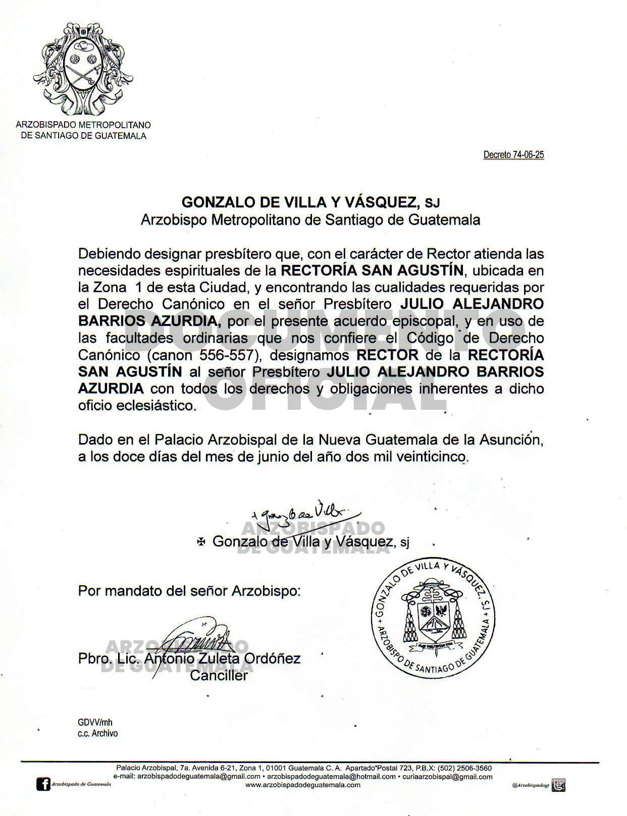 El señor Arzobispo de la Arquidiócesis de Santiago de Guatemala nombra Rector de la RECTORÍA SAN AGUSTÍN al señor Presbítero JULIO ALEJANDRO BARRIOS AZURDIA. DECRETO 74-06-2025