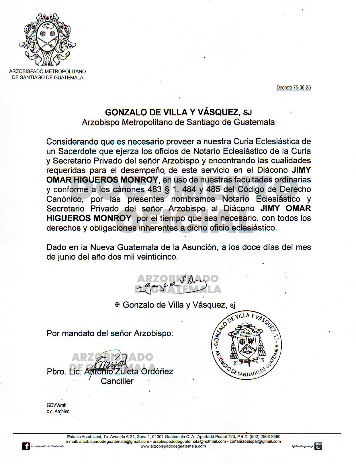 El señor Arzobispo de la Arquidiócesis de Santiago de Guatemala nombra NOTARIO ECLESIÁSTICO DE LA CURIA Y SECRETARIO PRIVADO al Diácono   JIMY OMAR HIGUEROS MONROY. DECRETO 75-06-2025