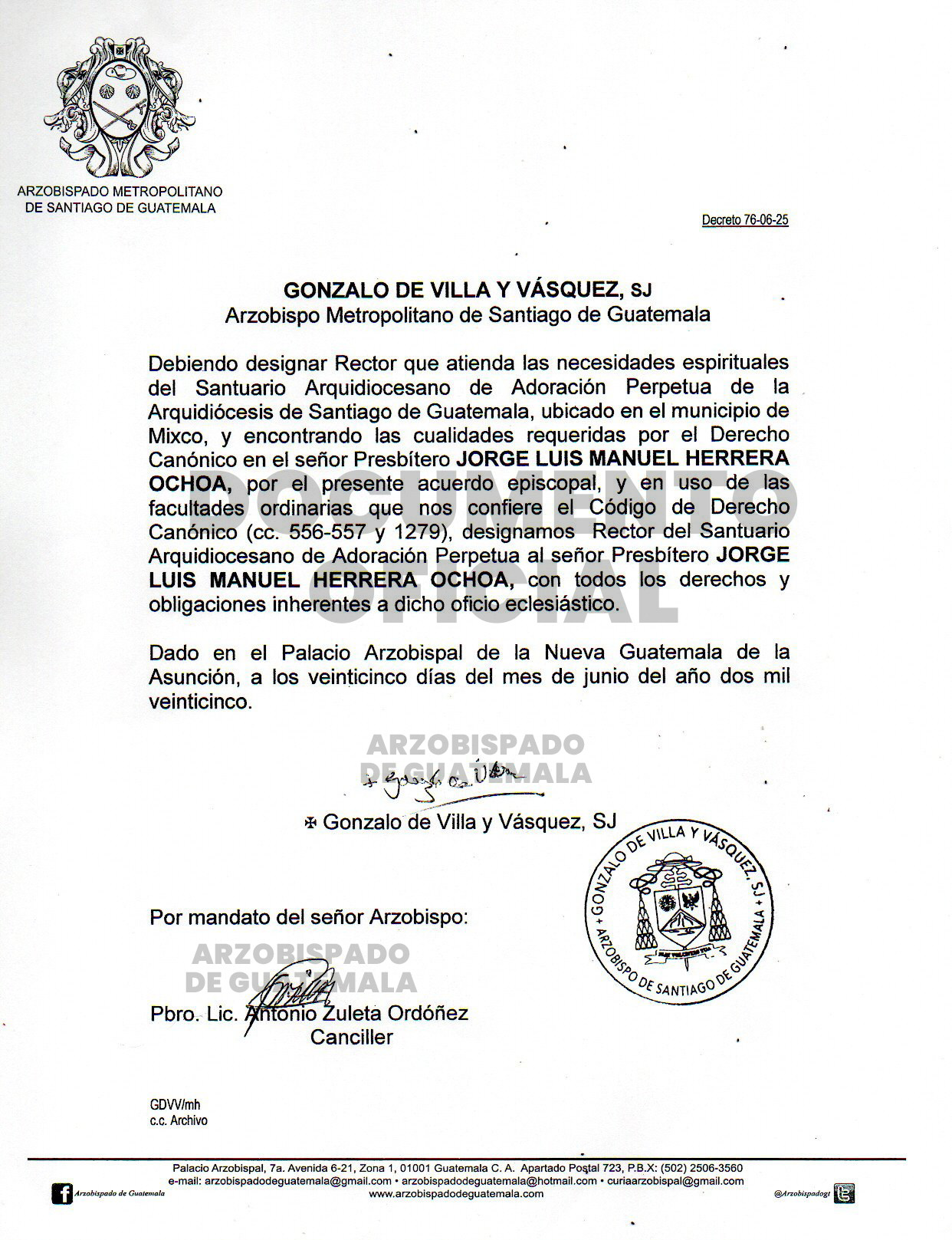 El señor Arzobispo de la Arquidiócesis de Santiago de Guatemala nombra Rector del SANTUARIO ARQUIDIOCESANO DE ADORACIÓN PERPETUA, ubicado en el munucipio de Mixco, al señor Presbítero JORGE LUIS MANUEL HERRERA OCHOA. DECRETO 76-06-2025