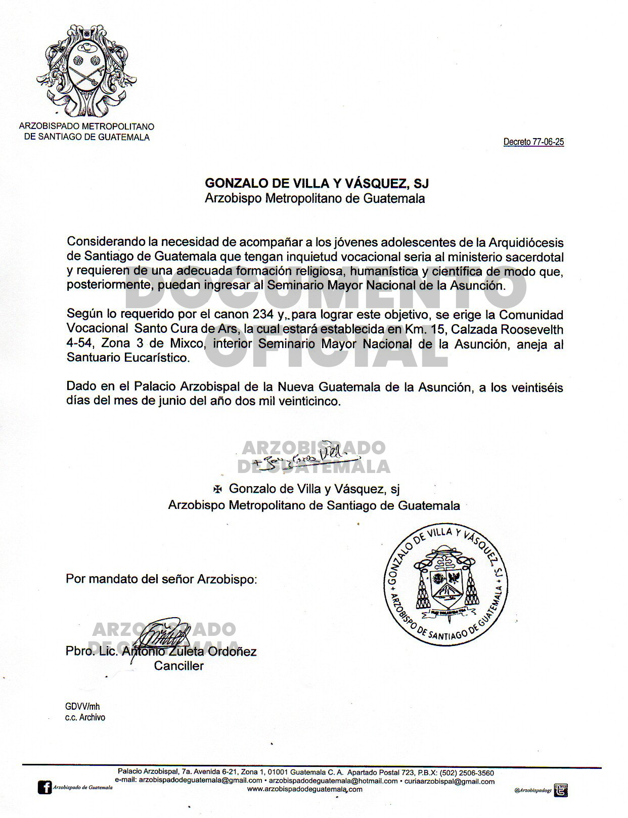 El señor Arzobispo de la Arquidiócesis de Santiago de Guatemala, erige la Comunidad Santo Cura de Ars, la cual estará establecida en Km. 15, Calzada Roosvetth 4-54 Zona 3 de Mixco, Interior Seminario Mayor Nacional de la Asunción, aneja al Santuario EucarísticoDECRETO 77-06-2025
