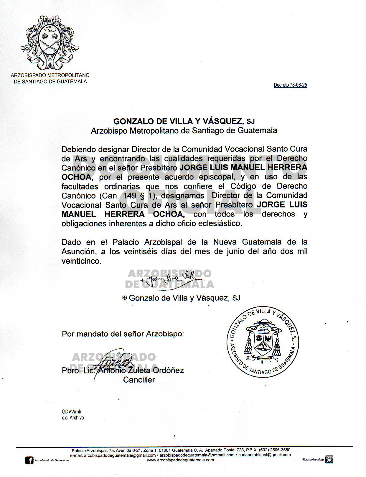 El señor Arzobispo de la Arquidiócesis de Santiago de Guatemala nombra como DIRECTOR DE LA COMUNIDAD SANTO CURA DE ARS, al señor Presbítero JORGE LUIS MANUEL HERRERA OCHOA. DECRETO 78-06-2025