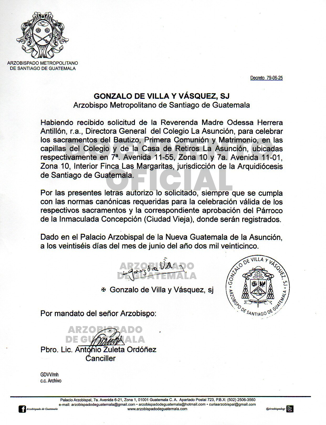 El señor Arzobispo de la Arquidiócesis de Santiago de Guatemala autoriza que se celebrén los sacramentos del Bautizo, Primera Comunión, y Matrimonio, en las capilas del Colegio La Asunción y de la Casa de Retiro La Asunción ubicadas respectivamente en 7ª. Avenida 11-55 Zona 10 y 7ª. Avenida 11-01 Zona 10, Interior Finca Las Margaritas, juridición de la Arquidiócesis de Santiago de Guatemala. DECRETO 79-06-202