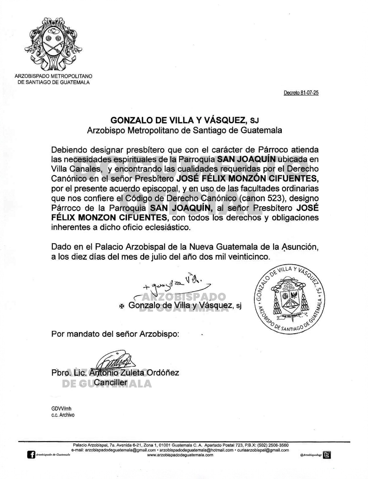 El señor Arzobispo de la Arquidiócesis de Santiago de Guatemala nombra Párroco de la Parroquia SAN JOAQUÍN, ubicada en Villa Canales, al señor Presbítero JOSÉ FÉLIX MONZON CIFUENTES. DECRETO 81-07-2025