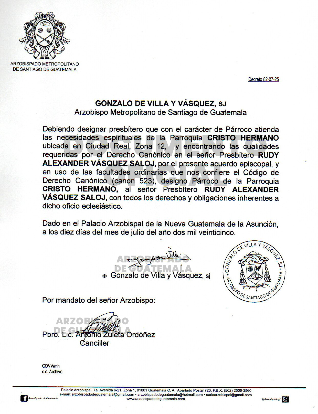 El señor Arzobispo de la Arquidiócesis de Santiago de Guatemala nombra Párroco de la Parroquia CRISTO HERMANO, ubicada en Ciudad Real, Zona 12, al señor Presbítero RUDY ALEXABDER VÁSQUEZ SALOJ. DECRETO 82-07-2025