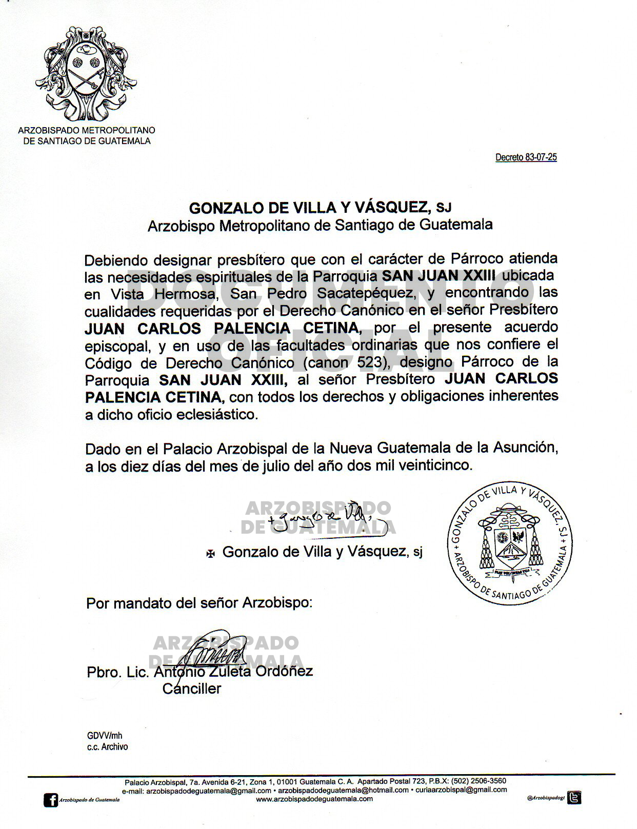 El señor Arzobispo de la Arquidiócesis de Santiago de Guatemala nombra Párroco de la Parroquia SAN JUAN XXIII, ubicada en Vista Hermosa, San Pedro Sacatepéquez, al señor Presbítero JUAN CARLOS PALENCIA CETINA. DECRETO 83-07-2025