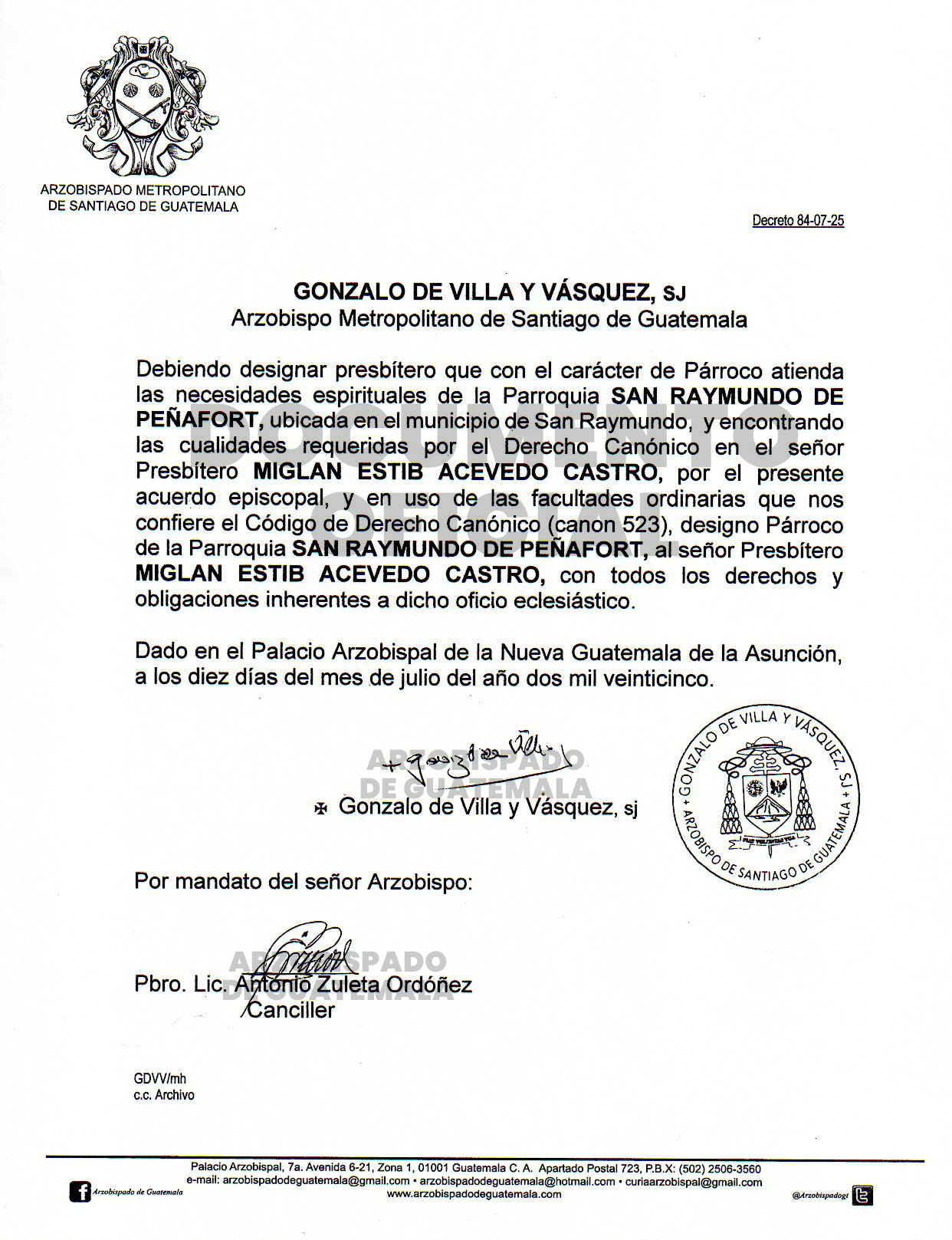 El señor Arzobispo de la Arquidiócesis de Santiago de Guatemala nombra Párroco de la Parroquia SAN RAYMUNDO DE PEÑAFORT, ubicada en el municipio de San Raymundo, al señor Presbítero MIGLAN ESTIB ACEVEDO CASTRO. DECRETO 84-07-2025