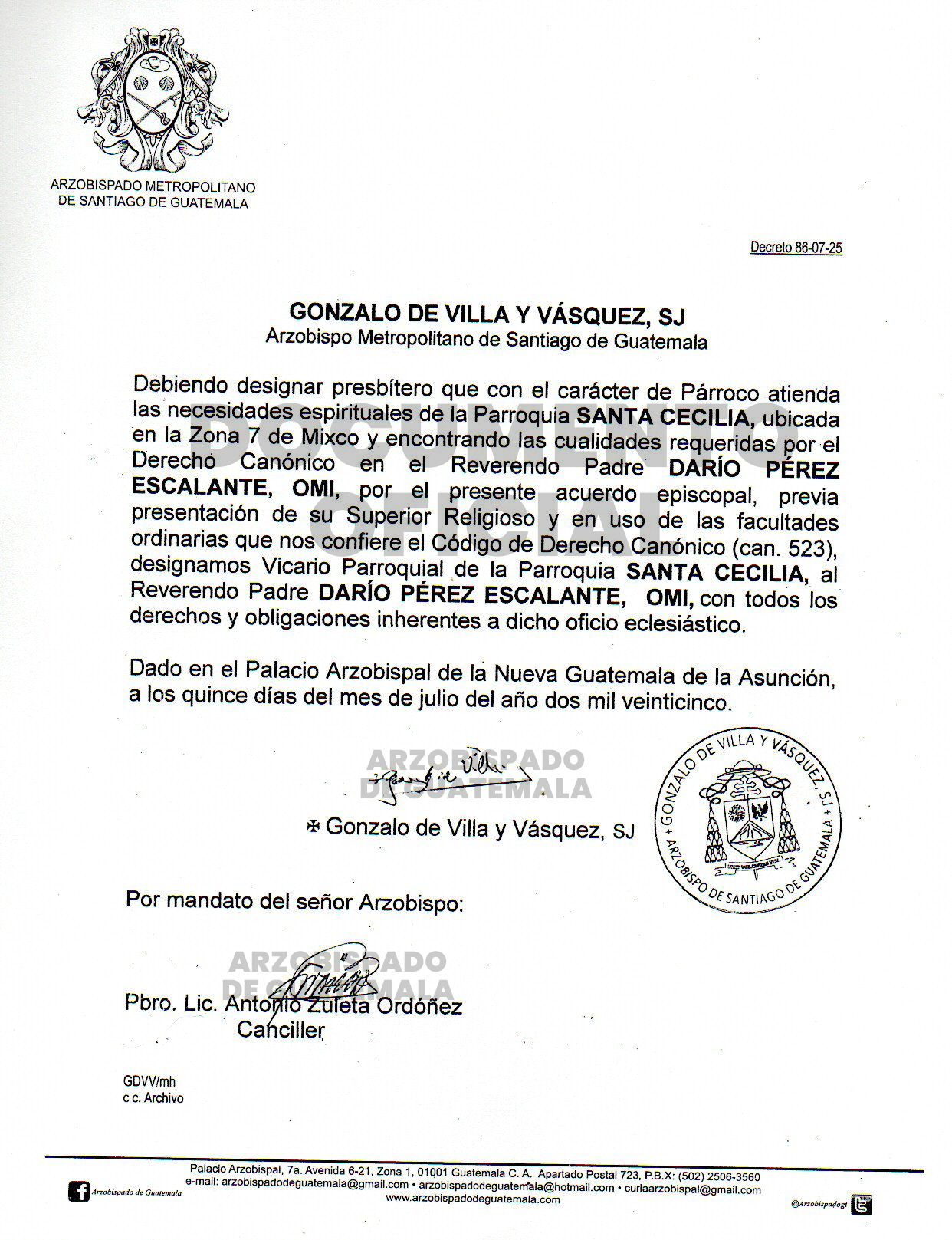 El señor Arzobispo de la Arquidiócesis de Santiago de Guatemala, nombra Párroco de la Parroquia SANTA CECILIA, ubicada en Zona 7 de Mixco, al Reverendo Padre  DARIO PÉREZ ESCALANTE, OMI. DECRETO 86-07-2025