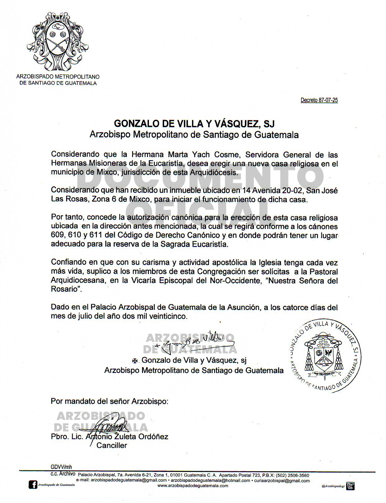 El señor Arzobispo de la Arquidiócesis de Santiago de Guatemala, autoriza la erección de una casa de las Hermanas Misioneras de la Eucaristía ubicada en las 14 Avenida 20-02, San José Las Rosas, Zona 6 de Mixco donde podrán tener un lugar adecuado para la reserva de la Sagrada Eucaritía, asi mismo suplica a los miembros de la congregación ser solicitas a la Pastoral Arquidiocesana, en la Vicaría Episcopal del Nor-Occidente, “Nuestar Señora del Rosario”. DECRETO 87-07-2025