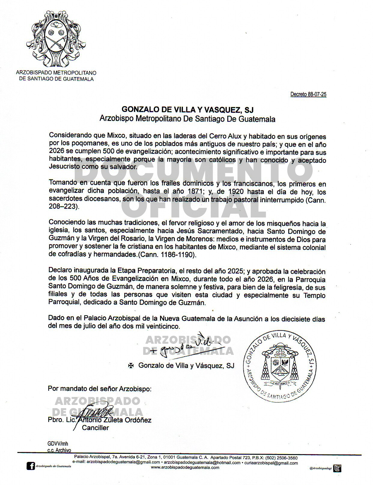 El señor Arzobispo de la Arquidiócesis de Santiago de Guatemala declara inaugurada la Etapa Preparatoria, y aprueba la celebración de los 500 Años de Evangelización en Mixco, durante el resto del año 2025 y todo el año 2026, en laParroquia Santo Domingo de Guzmán, de manera solemne y festiva, para el bien de la feligresía, de sus filiales y de todas las personas que visiten esta ciudad y especialmente su Templo Parroquial, dedicado a Santo Domingo de GuzmánDECRETO 88-07-2025