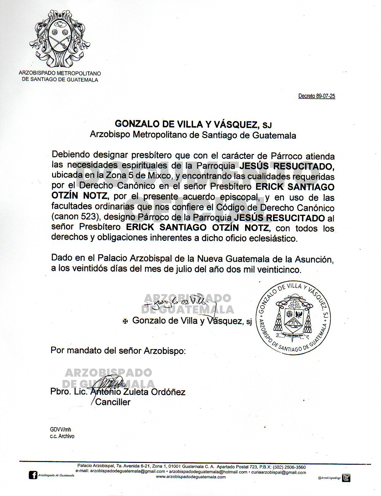 El señor Arzobispo de la Arquidiócesis de Santiago de Guatemala nombra Párroco de la Parroquia JESÚS RESUCITADO,  ubicada en la Zona 5 de Mixco, al señor Presbítero ERICK SANTIAGO OTZÍN NOTZ. DECRETO 89-07-2025