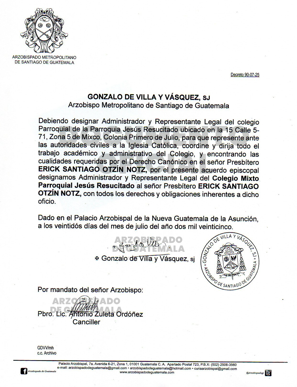 El señor Arzobispo de la Arquidiócesis de Santiago de Guatemala designa Administrador y Representante Legal del Colegio de la Parroquia JESÚS RESUCITADO, ubicada en la 15 calle 5-71 Zona 5 de Mixco, Colonia Primero de Julio, al señor Presbítero ERICK SANTIAGO OTZÍN NOTZ para que coordine y dirija todo el trabajo Académico y Administrativo del ColegioDECRETO 90-07-2025